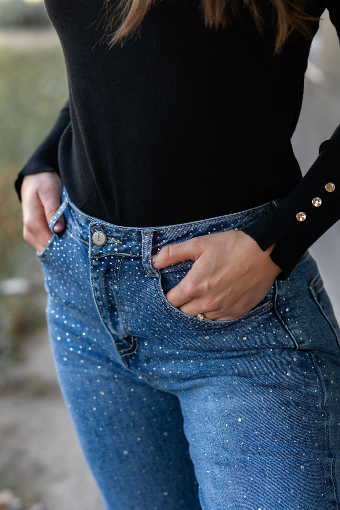 Ez a klasszikus, egyenes szárú kék farmernadrág igazán különleges darab, amelyet a tetején elhelyezett csillogó strasszok tesznek egyedivé. A díszítés úgy hat, mintha a strasszok finoman „lefelé hullanának”, így elegáns és trendi megjelenést kölcsönöz a nadrágnak.